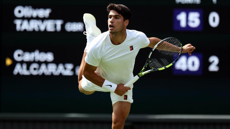 Sin excesivas complicaciones ni desgaste como sí sucedió en primera ronda, Carlos Alcaraz cumplió con el trámite ante Oliver Tarvet en Wimbledon. El tenista murciano, este miércoles con una versión mucho más sólida que contra Fognini, pone rumbo a tercera ronda con buenas sensaciones… pero admitiendo aspectos a mejorar en su juego, especialmente en su saque.