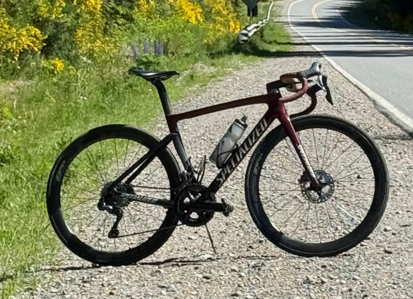Se trata de una bicicleta de competición de alto costo. Es marca Tarmac SL7 Expert, talle 52 con ruedas Zipp de carbono, manubrio Zipp carbono y pedales  Favero.