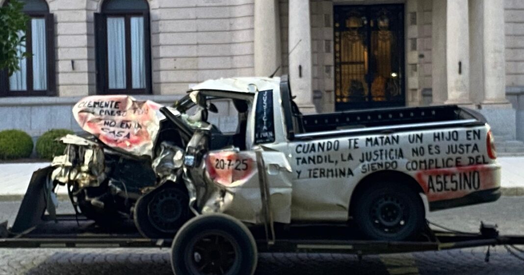 “Cuando te matan a un hijo en Tandil. La justicia no es justa y termina siendo cómplice de un asesino”, reza el escrito sobre la parte trasera de la camioneta blanca. Adelante casi no hay nada. El lugar del conductor está todo aplastado, lo que muestra lo fuerte del golpe que sufrió.